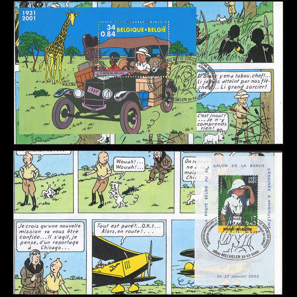 - (p. 61/62) Affranchissement Belgique BLOC 34F/0,84€ "Tintin au Congo 1931-2001"