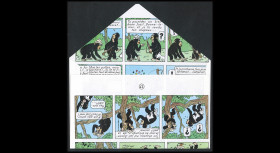 Comme nous l’avions déjà fait en 2001, pour l’émission commune entre le Congo et la Belgique d’un timbre et d’un bloc à l’occasion du 70ème anniversaire de l’album «Tintin au Congo» de 1931, mais également en 2007 pour la sortie d’un feuillet belge et de 6 timbres français «Centenaire de Hergé», père spirituel de Tintin, nous avons voulu créer une nouvelle fois un «1er jour» original et insolite, pour les tintinophiles et collectionneurs avertis. Pour cela, nous avons façonnées artisanalement des enveloppes à partir d’authentiques pages d’albums de Tintin correspondant aux timbres émis.