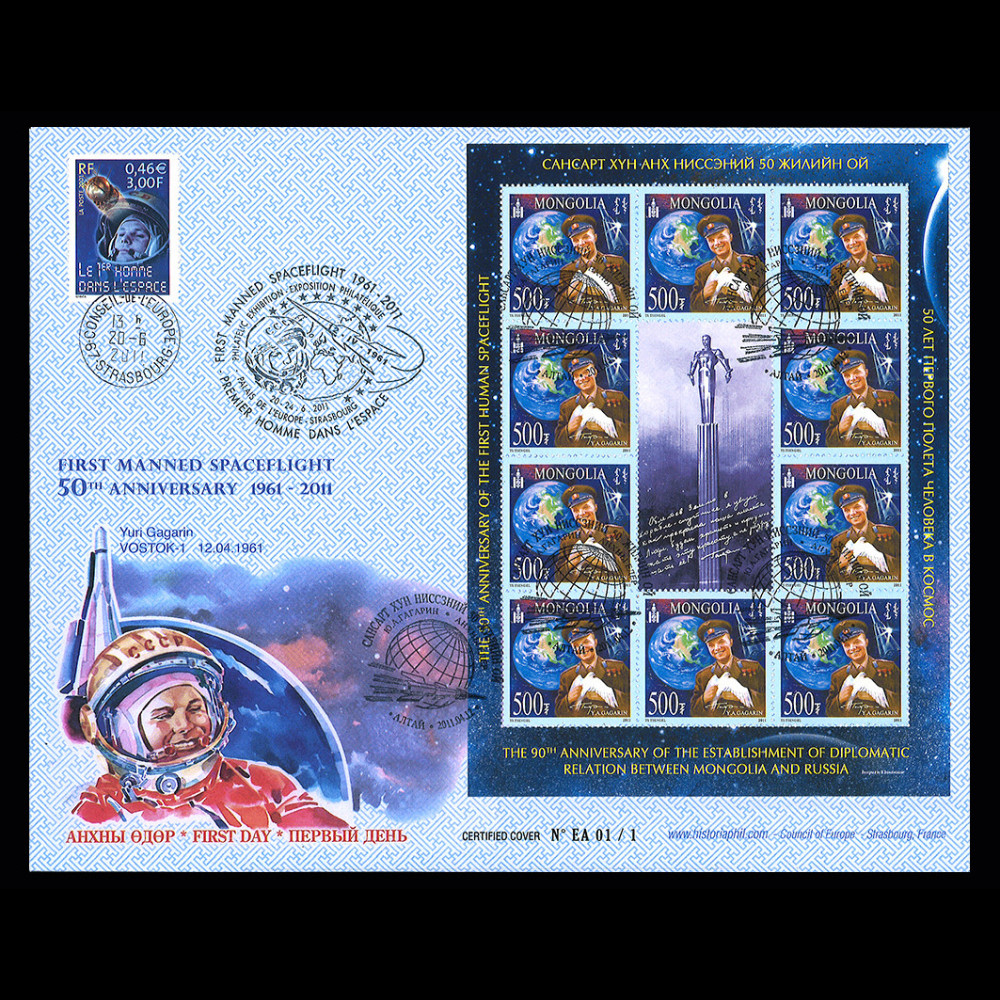 GAGARIN11-3BAE : Maxi FDC MONGOLIE Premier Jour du feuillet de 10 valeurs 500T "Youri GAGARINE tenant une colombe - 50e anniversaire du Premier Homme dans l'Espace 1961-2011" - Exemplaire unique ÉPREUVE D'ARTISTE sur papier épais, portant le N°EA 01 / 1