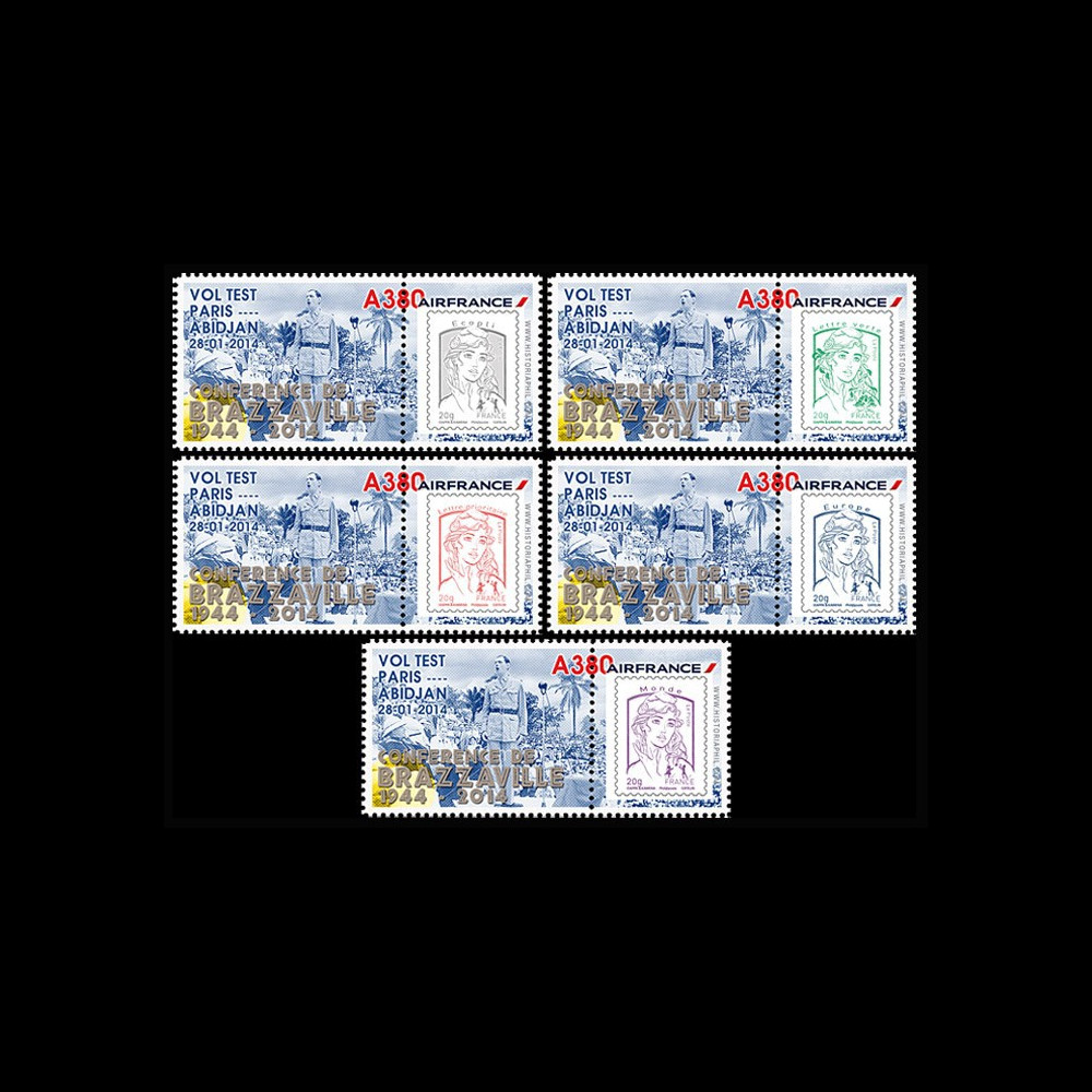 N°A380-253PT1/5 : FRANCE Série de 5 valeurs "Marianne et la Jeunesse, 2014" sur Porte-timbres privés dentelés et gommés "28.01.2014 : Vol Test Airbus A380 Air France AF 702 Paris CDG (France) - Abidjan ABJ (Côte d'Ivoire) : Opération de Soutien de la compagnie aérienne Air France au Forum international des investissements en Côte d’Ivoire / 1944-2014 : 70e anniversaire de la Conférence de Brazzaville (République du Congo) - Général DE GAULLE" (TYPE 1) 2014 :