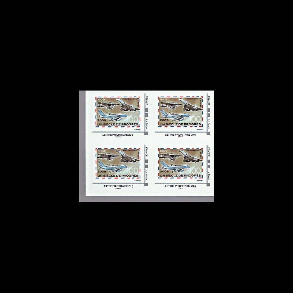 N°A380-97B4 : Bloc de 4 tpp France Lettre prioritaire 20g “1909-2009 Un Siècle de Progrès” (avions Blériot, Concorde et A380) coin de feuille