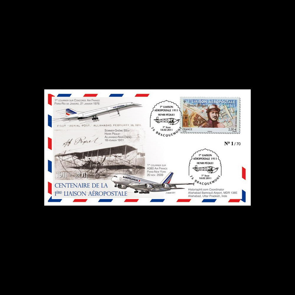 N°A380-124 : First Flight Cover (FFC) “1911-2011 : Centenary of the first Airmail / Sommer-Gnôme 50hp of Henri Péquet, Concorde and A380 Air France"