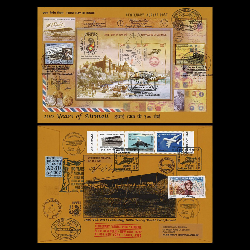 + Block of 3 labels "Indipex 2011 - H. Pequet - Concorde - Airbus A380" postmarked in New Delhi "Indipex 2011 - 100 Years of Airmail" (India) dated February 12, 2011