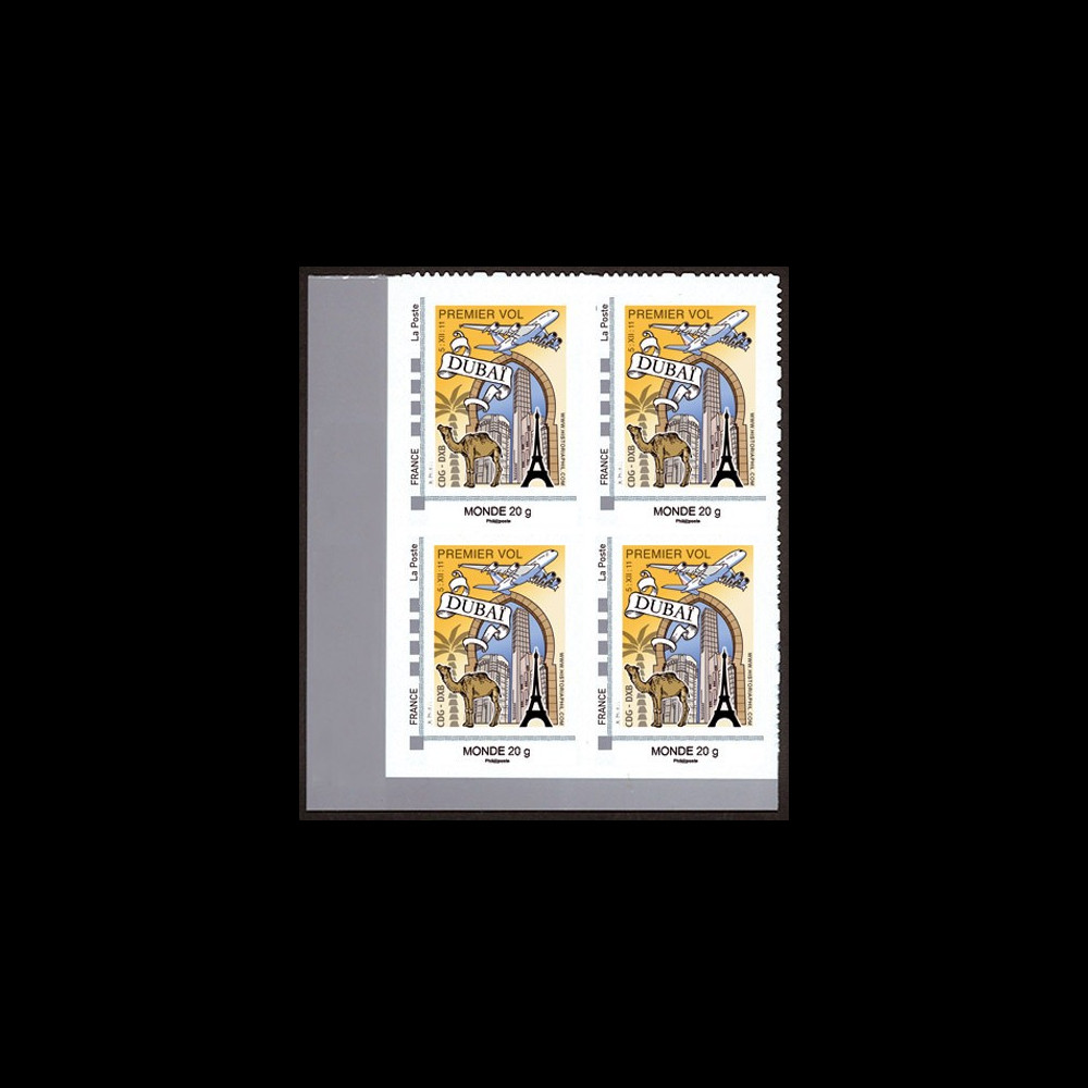 N°A380-172B4 : FRANCE Block of 4 values Personalized Stamps World Letter 20g "December 5, 2011 : First Flight Airbus A380 Air France AF3830 Paris CDG (France) - Dubai DXB (United Arab Emirates) / Eiffel Tower and Camel" 2011 :