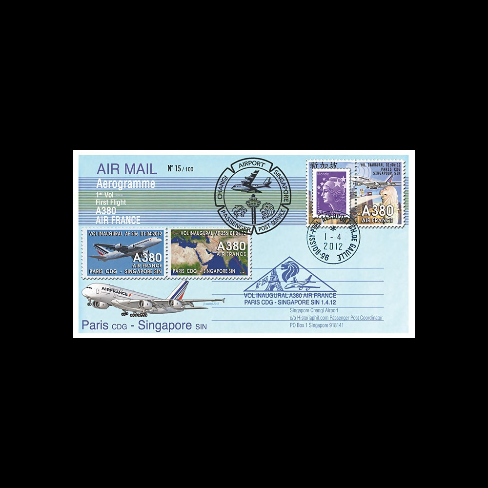 N°A380-177 : First Flight Cover (FFC) FRANCE "April 1, 2012 : First Flight Airbus A380 Air France AF256 Paris CDG (France) - Singapore SIN (Republic of Singapore)" 2012 :