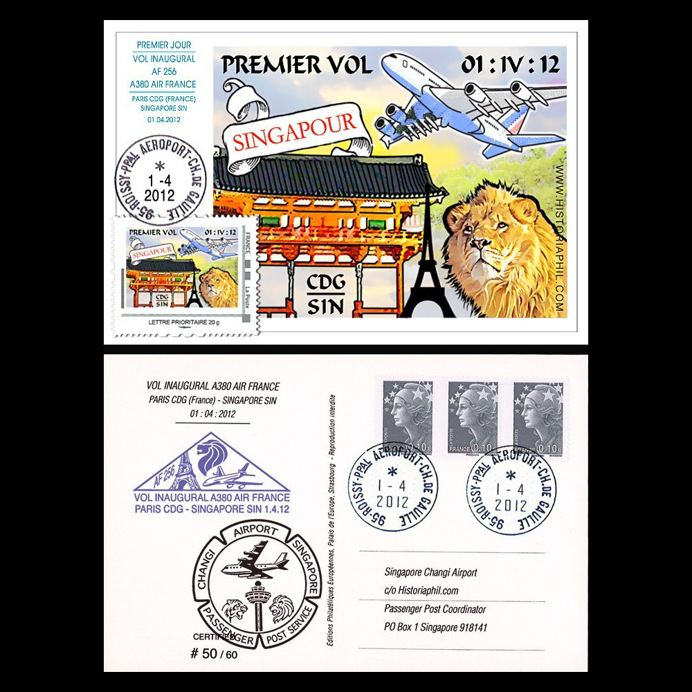 + Blue cachet "Airbus A380 Air France - Maiden Flight AF256 Paris CDG - Singapore SIN / Eiffel Tower" (France) dated April 1, 2012 on back