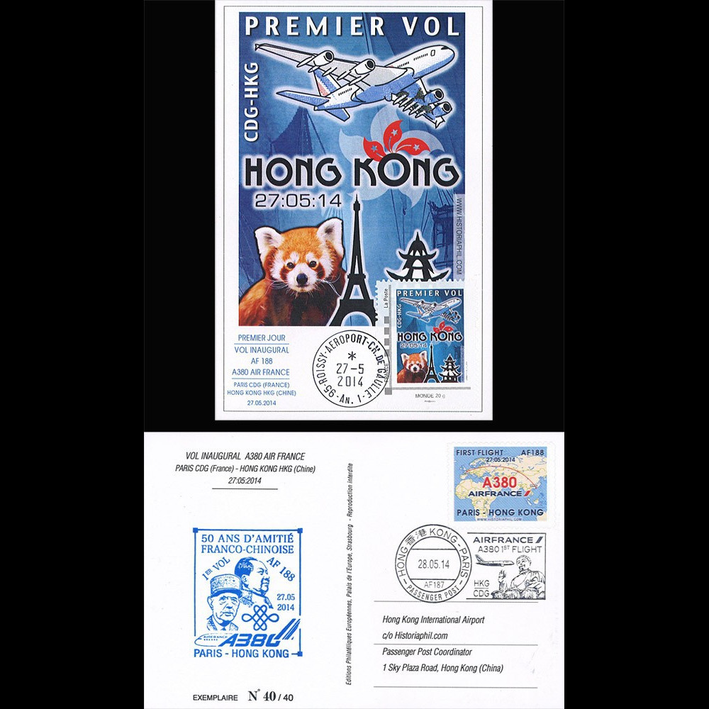 + Blue cachet "Airbus A380 Air France - First Flight AF188 Paris-Hong Kong / 50 years of the Friendship between France and China - DE GAULLE & MAO ZEDONG" (France) dated May 27, 2014 on back