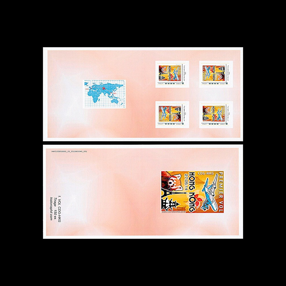 N°A380-262C : FRANCE Collector Booklet of 4 Personalized Stamps Priority letter 20g INVERTED PAGES YELLOW "May 27, 2014 : First Flight Airbus A380 Air France AF 188 Paris CDG (France) - Hong Kong HKG (China) / Eiffel Tower & Red Panda" (Size 140 x 297 mm ; unfolded) 2014 :