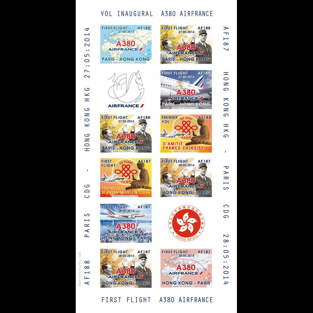N°A380-262FND : Sheetlet of 12 labels gummed and not perforated "May 27, 2014 : First Flight Airbus A380 Air France AF 188 Paris CDG (France) - Hong Kong HKG (China) / 1964-2014 : 50th anniversary of the Friendship between France and China - Mr. MAO ZEDONG, President of the People's Republic of China and Mr. Charles DE GAULLE, President of France" (Size : 10,4 x 21 cm) 2014 :