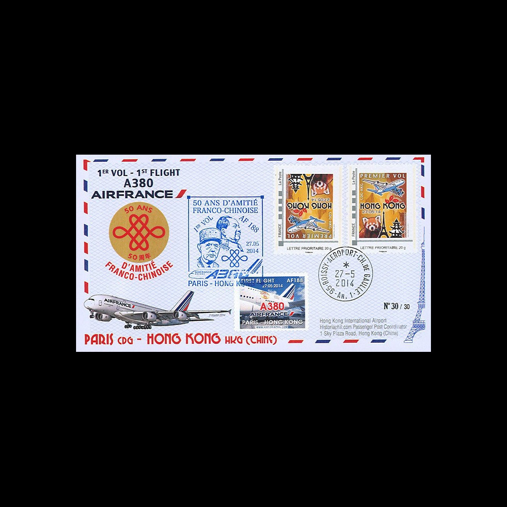 + Blue cachet "Airbus A380 Air France - First Flight AF188 Paris-Hong Kong / 50 years of the Friendship between France and China - DE GAULLE & MAO ZEDONG" (France) dated May 27, 2014