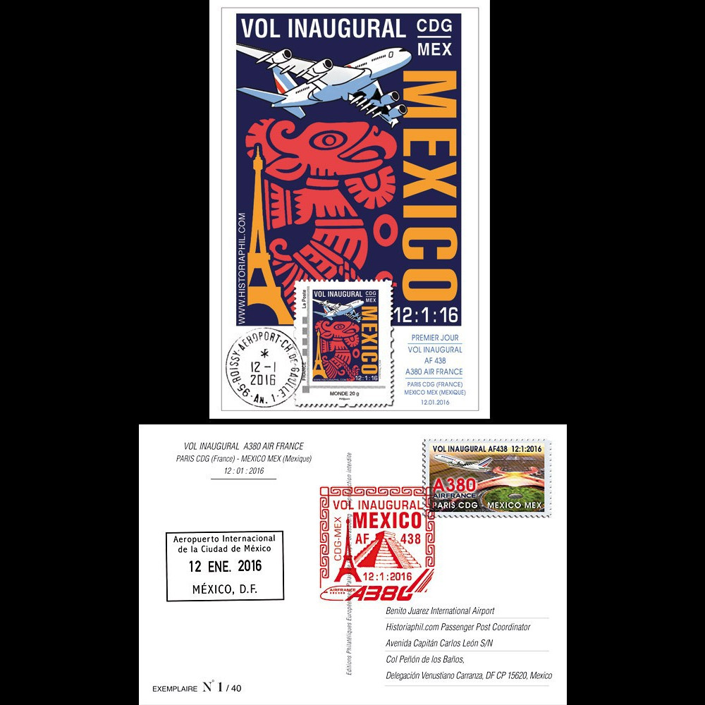 + Red cachet "Airbus A380 Air France - Maiden Flight AF438 Paris-Mexico / Eiffel Tower" (France) dated January 12, 2016