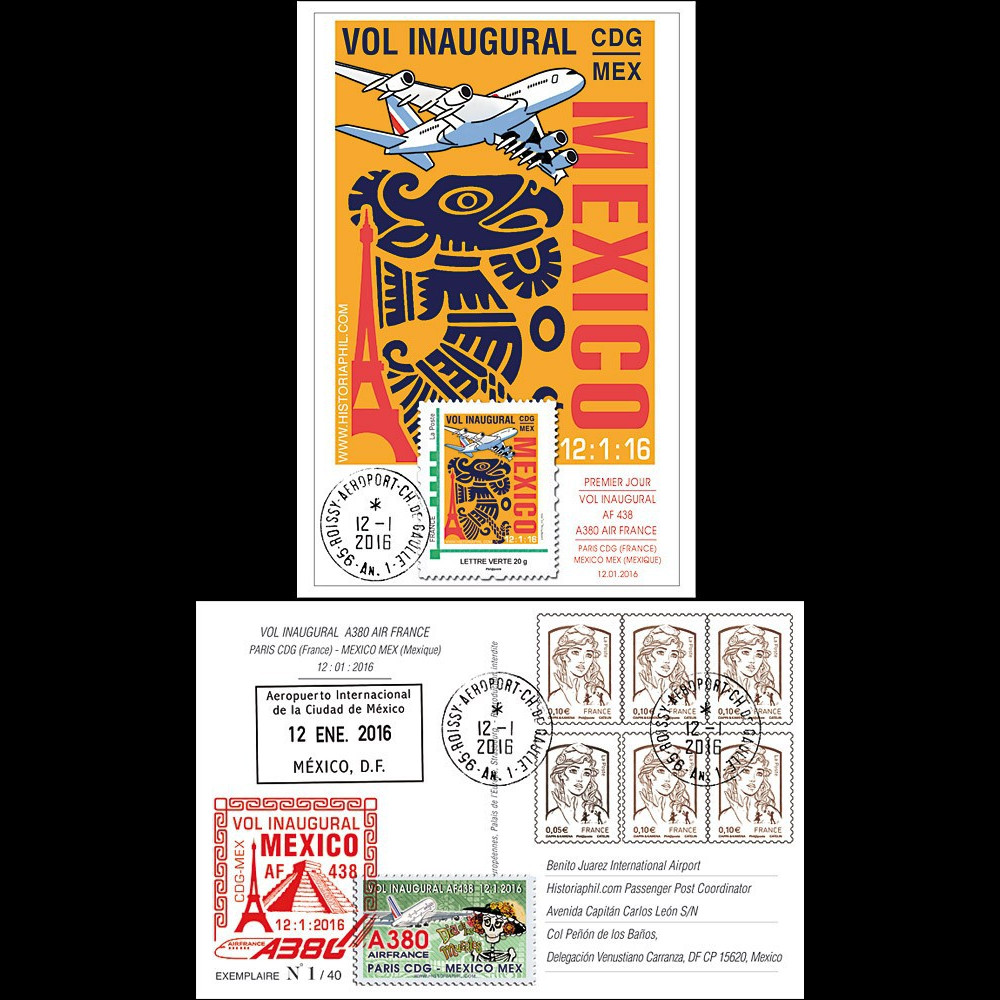 + Red cachet "Airbus A380 Air France - Maiden Flight AF438 Paris-Mexico / Eiffel Tower" (France) dated January 12, 2016