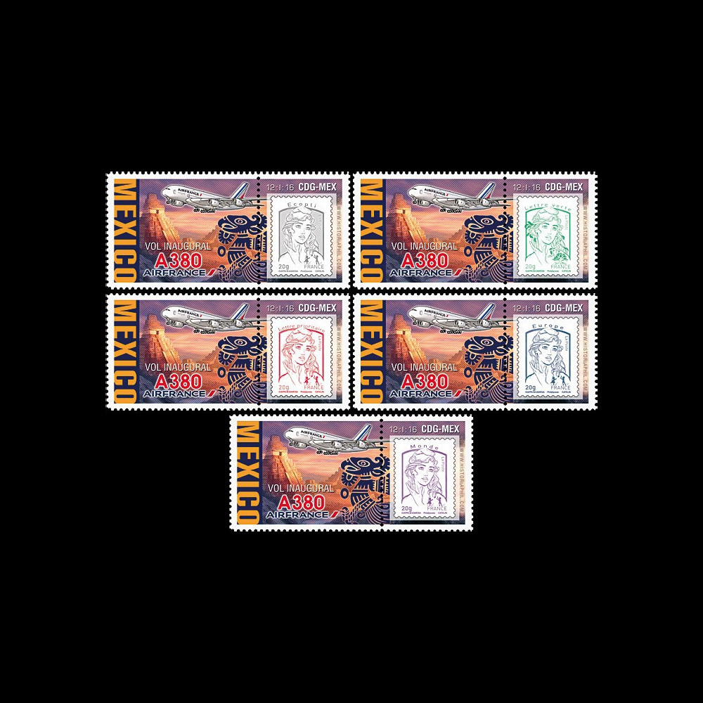 N°A380-296PT1/5 : FRANCE - Set of 5 Marianne "Marianne and Youth, 2016" on Private display units perforated and gummed "January 12, 2016 : First Flight Airbus A380 Air France AF 438 Paris CDG (France) - Mexico MEX (Mexico)" 2016 :