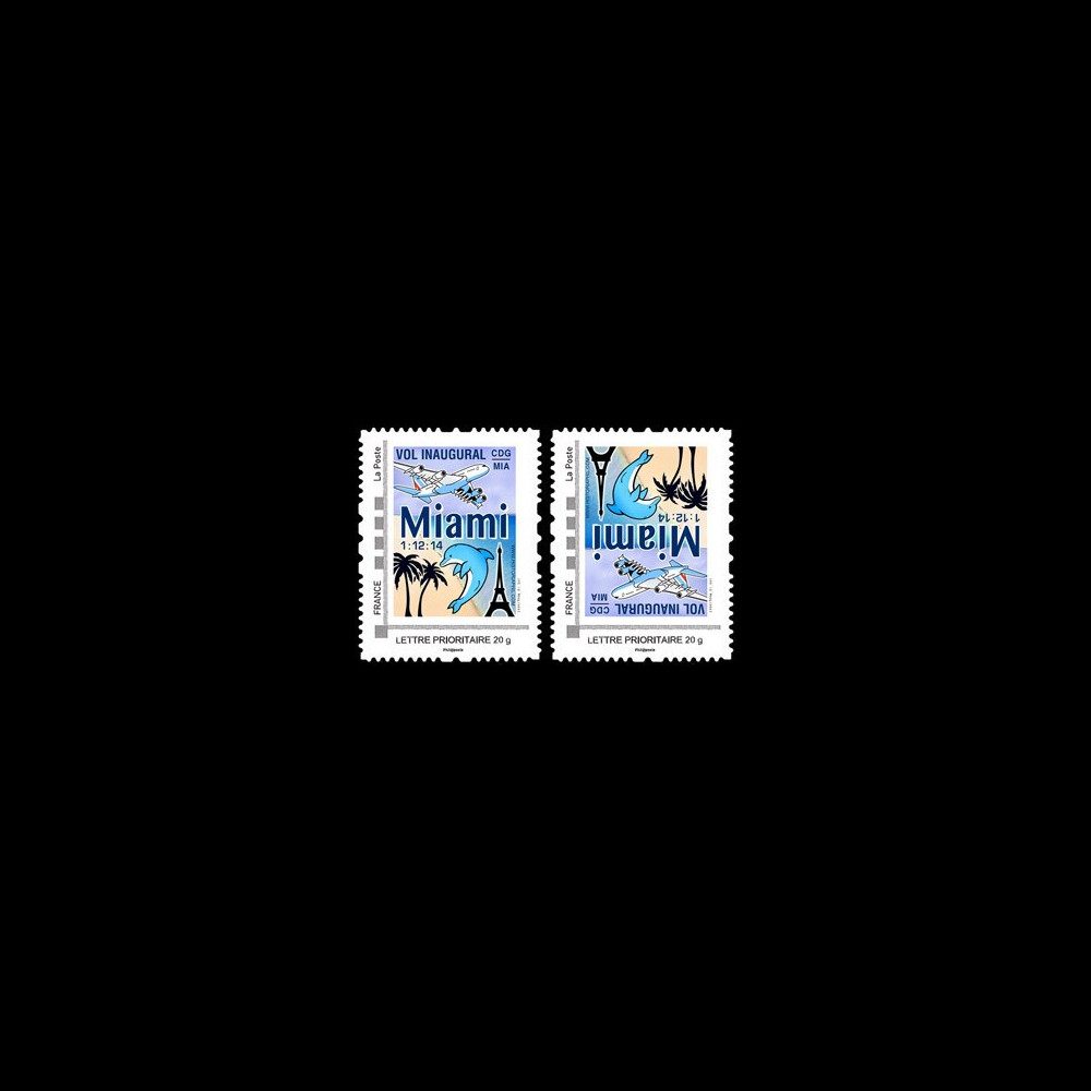 N°A380-288VN : FRANCE Set of 2 values Priority letter 20g VARIETY INVERTED PAGES "December 1st, 2014 : First Flight Airbus A380 Air France AF 090 Paris CDG (France) - Miami MIA (USA) / Dolphin, Eiffel tower, Palm trees, Airbus A380"