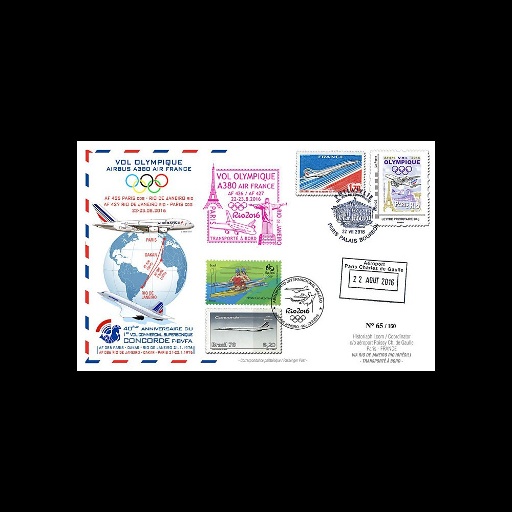 N°A380-299T2 : Maxi-FFC carried on board “August 22-23, 2016 : Olympic Flight A380 Air France AF 426 Paris - Rio and AF 427 Rio - Paris / 40th anniversary of the 1st commercial flight Concorde“ with philatelic postal link France-Brasil