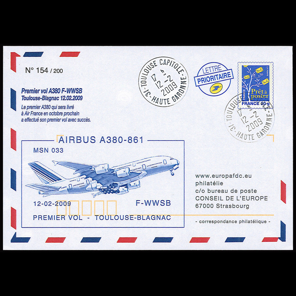 Toulouse-Blagnac Airport, 02.12.2009: The Airbus MSN 033 registered F-WWSB successfully completed its first test flight at the start of the afternoon. The event deserves to be cited as it is the first Airbus A380 to be delivered to Air France.