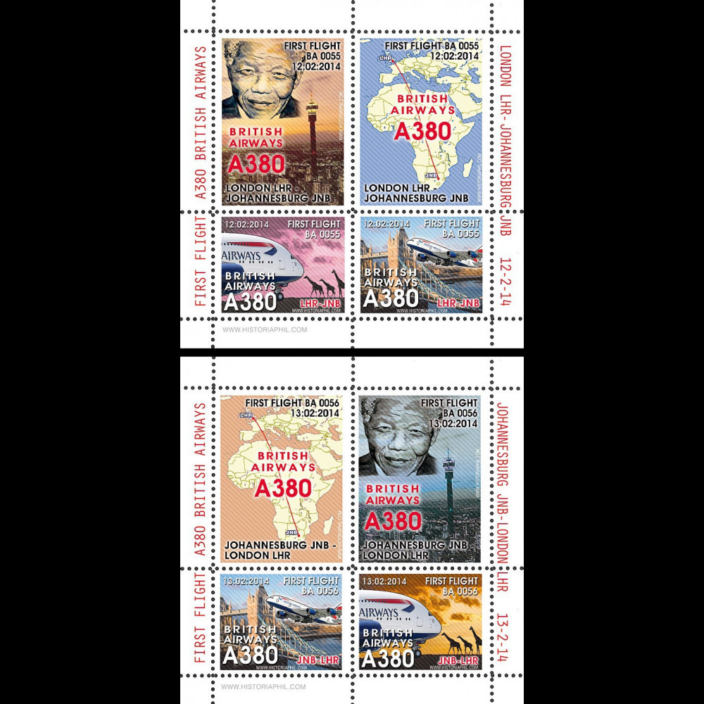 A380-246/247BD : 2 blocks of 4 labels UNITED KINGDOM / SOUTH AFRICA "12.02.2014 : 1st flight Airbus A380 British Airways BA 0055 London LHR - Johannesburg JNB (South Africa)"