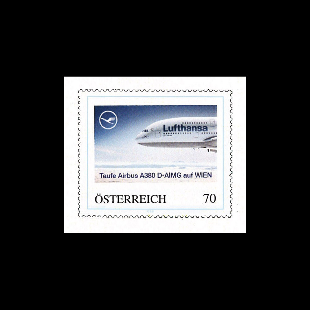 This personalized stamp was issued to commemorate the baptism of the Airbus A380 D-AIMG from Lufthansa Company on August 22, 2011 to Vienna, called "Wien".