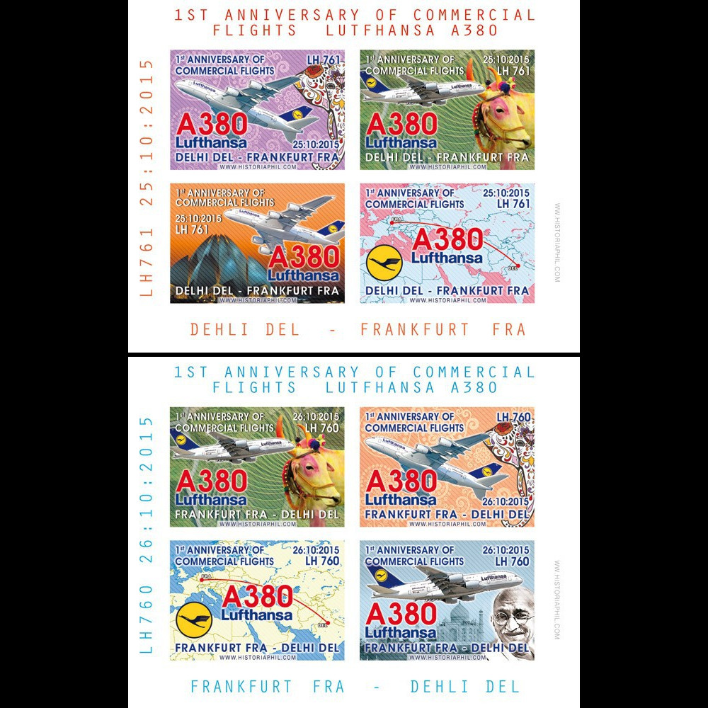 N°A380-292BND : Set of 2 blocks of 8 non-perforated and gummed labels "1st anniversary of 1st commercial flights A380 Lufthansa LH761/760 DELHI (India) - FRANKFURT (Germany) and FRANKFURT - DELHI 25-26.10.2015"