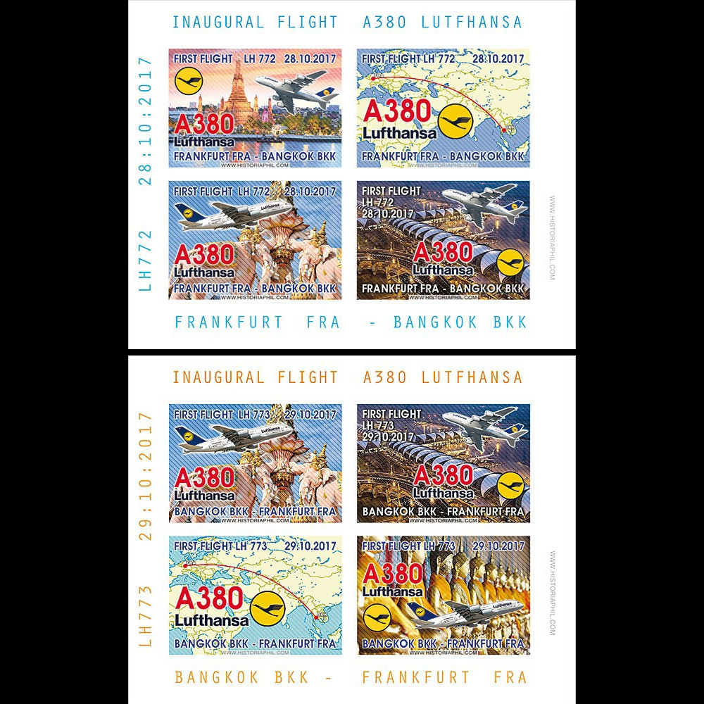 A380-302BND : set of 2 sheetlets of 8 labels “A380 Lufthansa first flight LH 772/773 FRANKFORT (Germany) - BANGKOK (Thailand) and return October 28-29, 2017“
