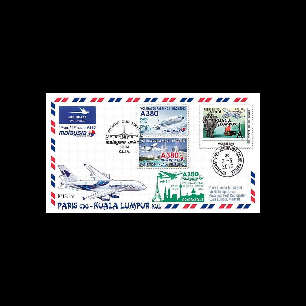 + Green cachet "Airbus A380 Malaysia Airlines - Maiden Flight MH 21 Paris CDG - Kuala Lumpur KUL / Eiffel Tower" (France) dated March 2, 2013