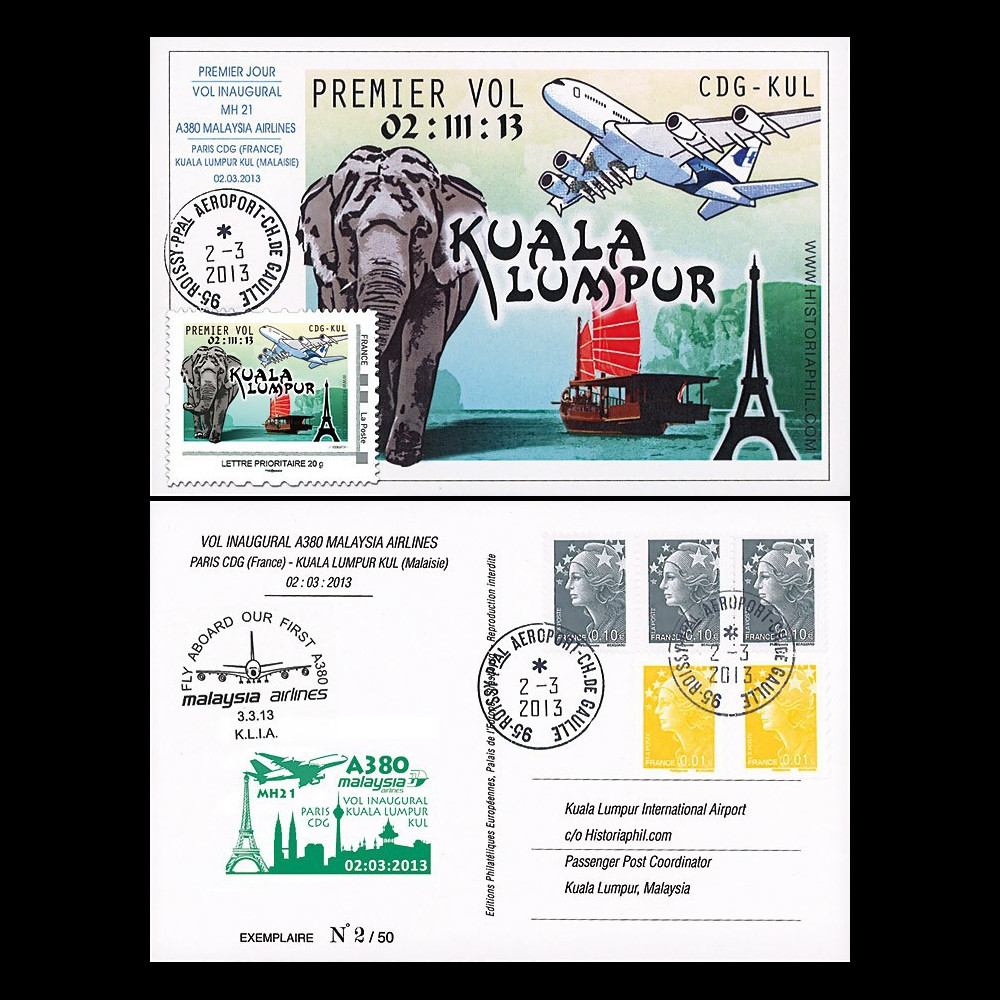 + Green cachet "Airbus A380 Malaysia Airlines - Maiden Flight MH 21 Paris CDG - Kuala Lumpur KUL / Eiffel Tower" (France) dated March 2, 2013 on back