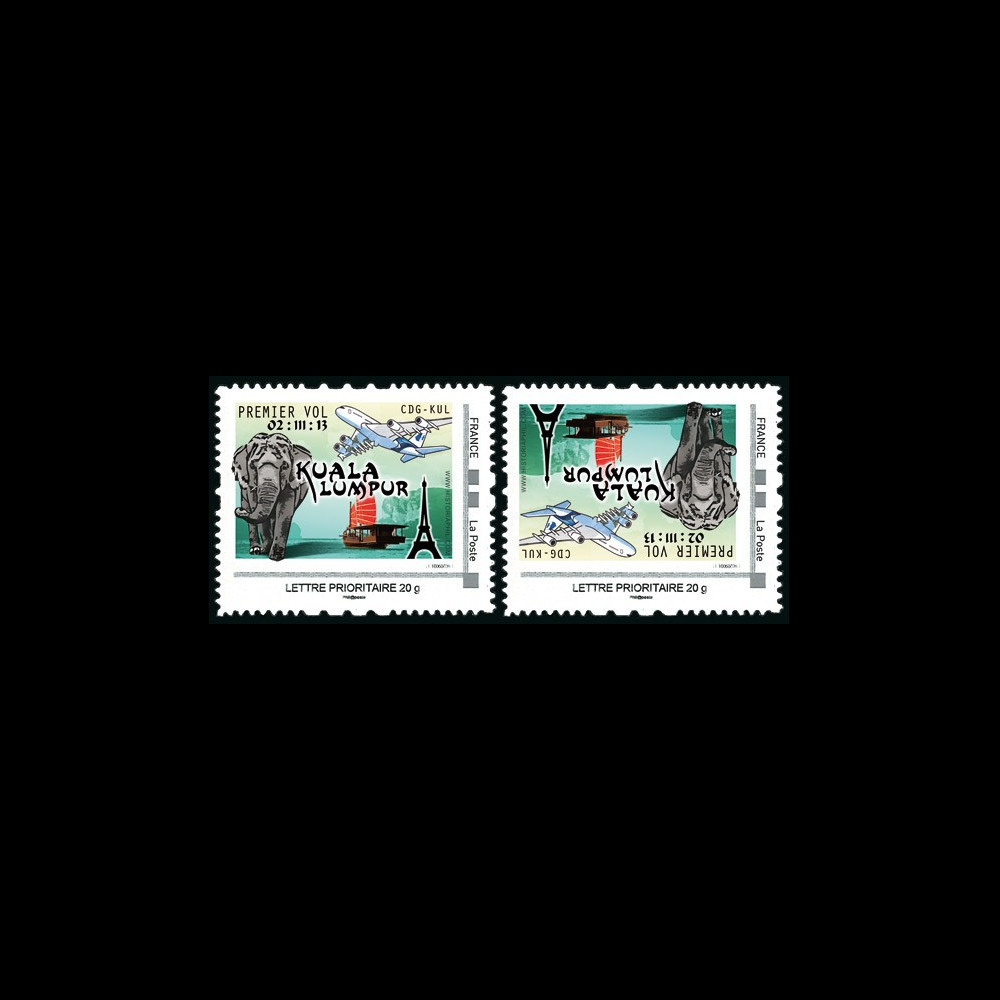 N°A380-216VN : FRANCE Set of 2 values Personalized stamps Priority letter 20g VARIETY INVERTED PAGES "March 2, 2013 : First Flight Airbus A380 Malaysia Airlines MH 021 Paris CDG (France) - Kuala Lumpur KUL (Malaysia) / Eiffel Tower - Boat & Elephant" 2013 :