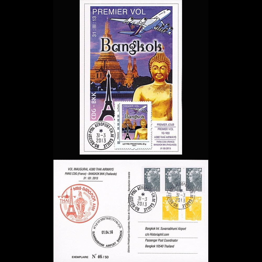 + Red cachet "Airbus A380 Thai Airways - Inaugural Flight TG 931 Paris - Bangkok / Eiffel Tower & Elephant" (France) dated March 31, 2013 on back