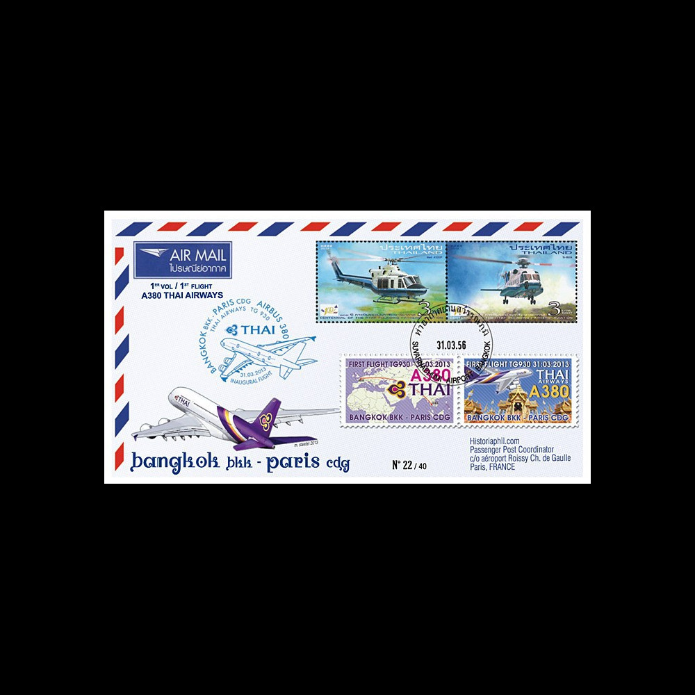 + Blue cachet "Airbus A380 Thai Airways - Inaugural Flight TG 930 Bangkok BKK - Paris CDG" (Thailand) dated March 31, 2013
