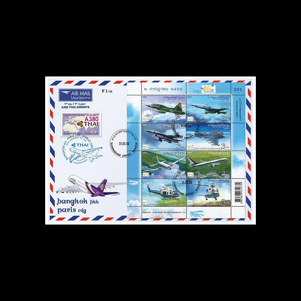 Franked Thailand sheetblock of 8 values 3Bath "Centennial of the RTAF Founding Fathers' Aviation : Aircrafts F-5B & F-5E - Aircrafts F-16 ADF & GRIPEN C - Aircrafts F-5B & F-5E - Aircrafts AVRO & Boeing 737-800 - Helicopter Bell 412EP & S-92A" cancelled with black cachet Bangkok "Suvarnabhumi Airport" (Thailand) dated 31.03.56 (Buddhist calendar = March 31, 2013)