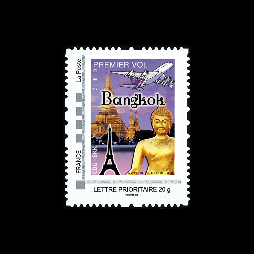 N°A380-220N : FRANCE 1 value Personalized stamp Priority letter 20g "March 31, 2013 : Maiden Flight Airbus A380 Thai Airways TG 931 Paris CDG (France) - Bangkok BKK (Thailand) / Eiffel Tower - Big Buddha" 2013 :