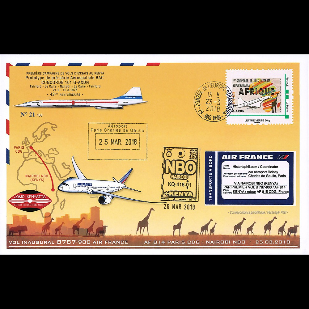 CO-RET84 : Maxi-FFC (208 x 135mm) carried on board “Inaugural flight B787-900 Air France AF 814 Paris - Nairobi, 25-26.03.2018 / in commemoration of the 43 years of the first campaign of supersonic test flights in Africa of the prototype Concorde G-AXDN 1975-2018“
