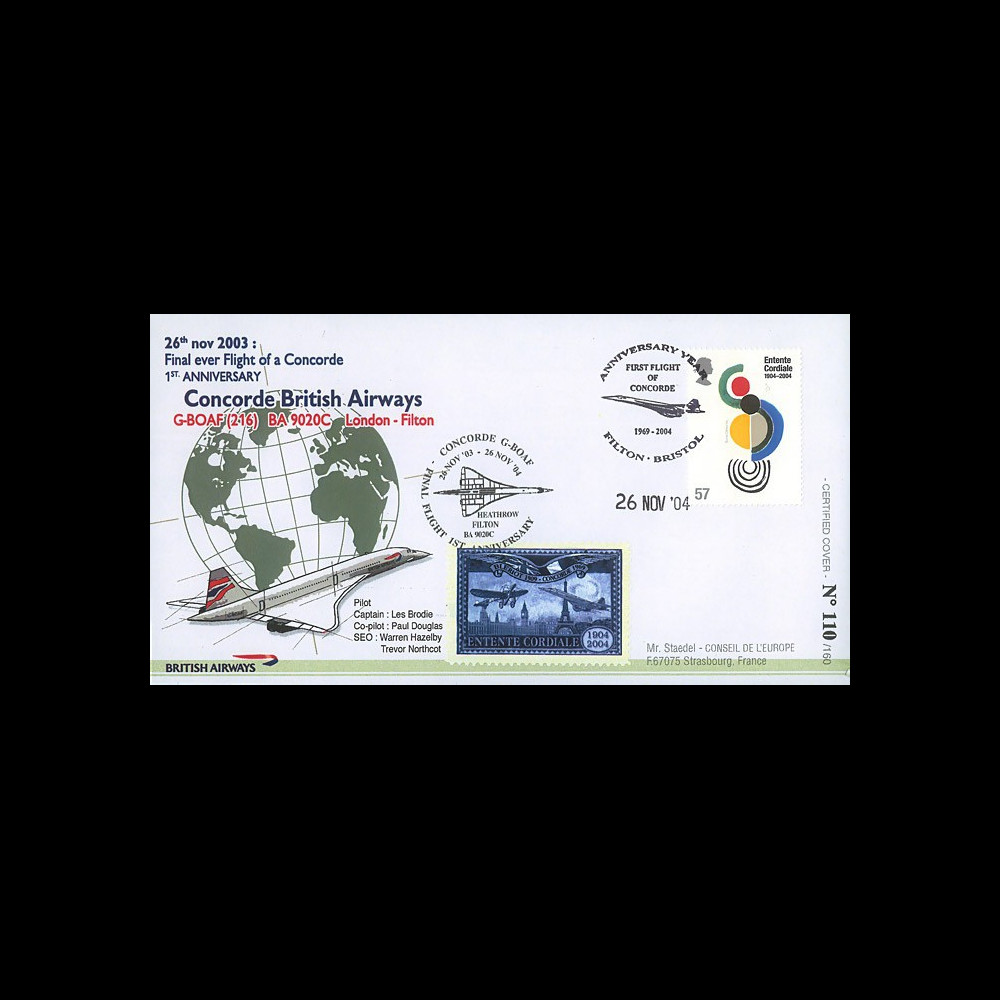 N°CO-RET V19 : FDC Great Britain "1st anniversary of the last flight of Concorde British Airways G-BOAF (216) BA 9020C London-Filton"