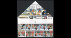 The Belgian Post wanted the centenary of Hergé's birth not to go unnoticed. As a tribute to this great artist, it has decided to issue a superb sheet of 25 special stamps, illustrated with 24 covers of the Tintin albums, each presented in a different language with, in the centre, a portrait of the author. "Presale" May 19, 2007, "First Day of Issue" May 22, 2007.