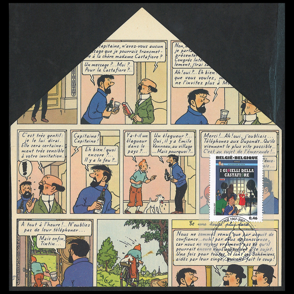 The Belgian Post wanted the centenary of Hergé's birth not to go unnoticed. As a tribute to this great artist, it has decided to issue a superb sheet of 25 special stamps, illustrated with 24 covers of the Tintin albums, each presented in a different language with, in the centre, a portrait of the author. "Presale" May 19, 2007, "First Day of Issue" May 22, 2007.