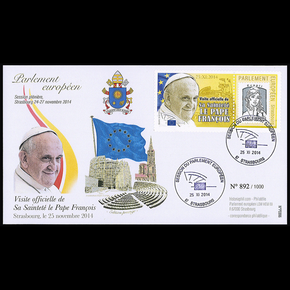 - Postage France Ecopli 20g "Marianne and Youth" on perforated label stamp holder "25.XI.2014 Official visit of His Holiness Pope Francis - European Parliament, Strasbourg"