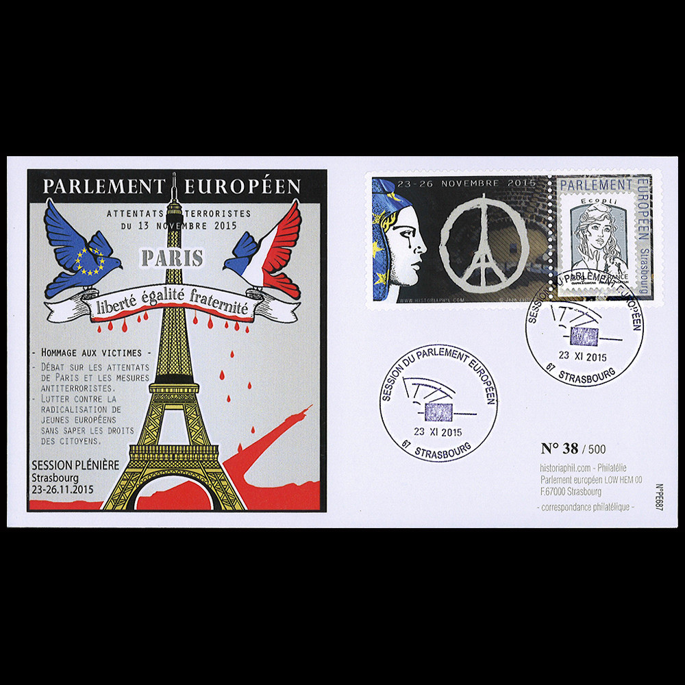 N°PE687 : FDC Session of the European Parliament to Strasbourg (France) November 23-26, 2015 "November 23-26, 2015 : Tribute for the victims of the Terrorist Attacks against Paris (France) - Debate on Paris attacks and anti-terror measures / MARIANNE" 2015 :