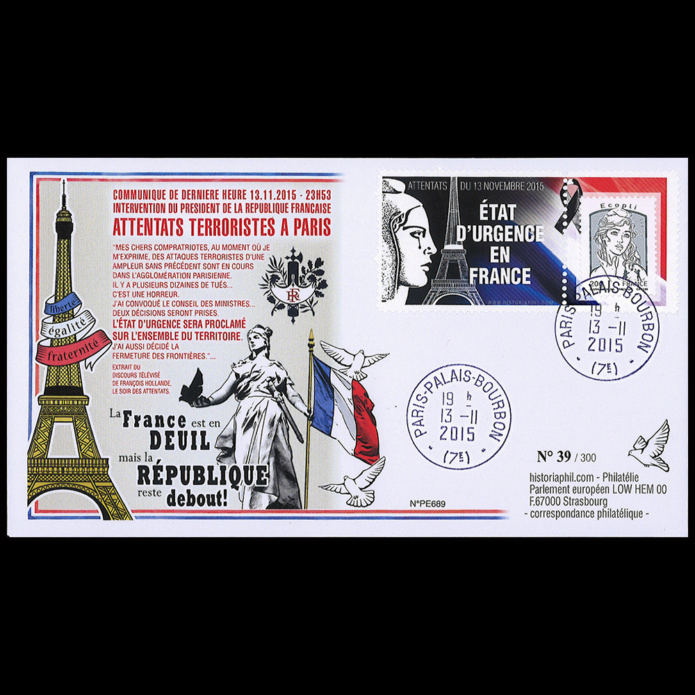 N°PE689 : FDC FRANCE "November 13, 2015 : Mr. François HOLLANDE, President of France proclaims the STATE OF EMERGENCY IN FRANCE after the Terrorist Attacks against Paris (France) / MARIANNE" 2015 :
