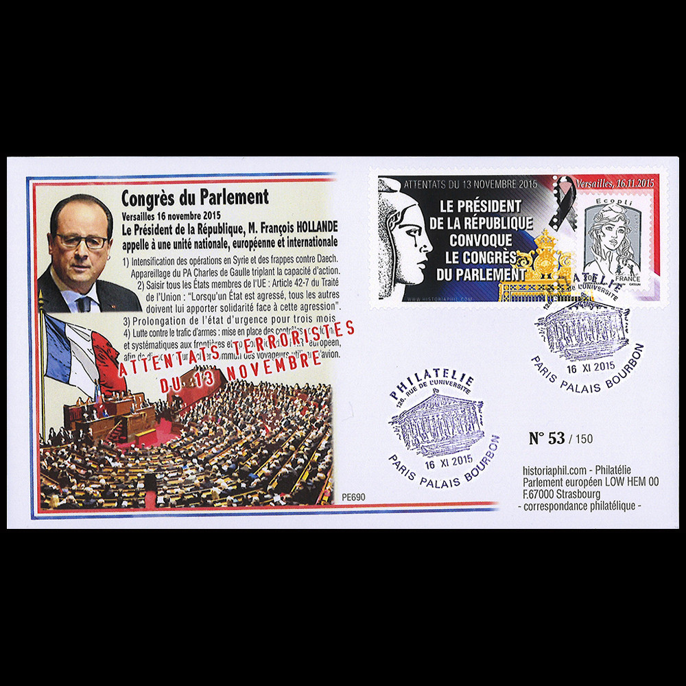 N°PE690 : FDC FRANCE "November 16, 2015 : President François Holland convene the Congress of Parliament in Versailles after the Terrorist Attacks against Paris (13 Nov. 2015) / MARIANNE"