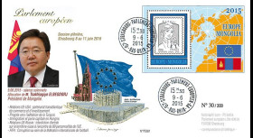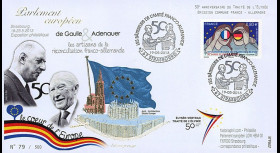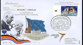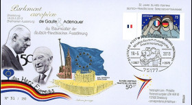 Postmarked in Pforzheim (temporary office at the European Parliament in Strasbourg) illustrated cachet "50 Jahre Deutsch-Französiche Zusammenarbeit" dated May 19, 2013