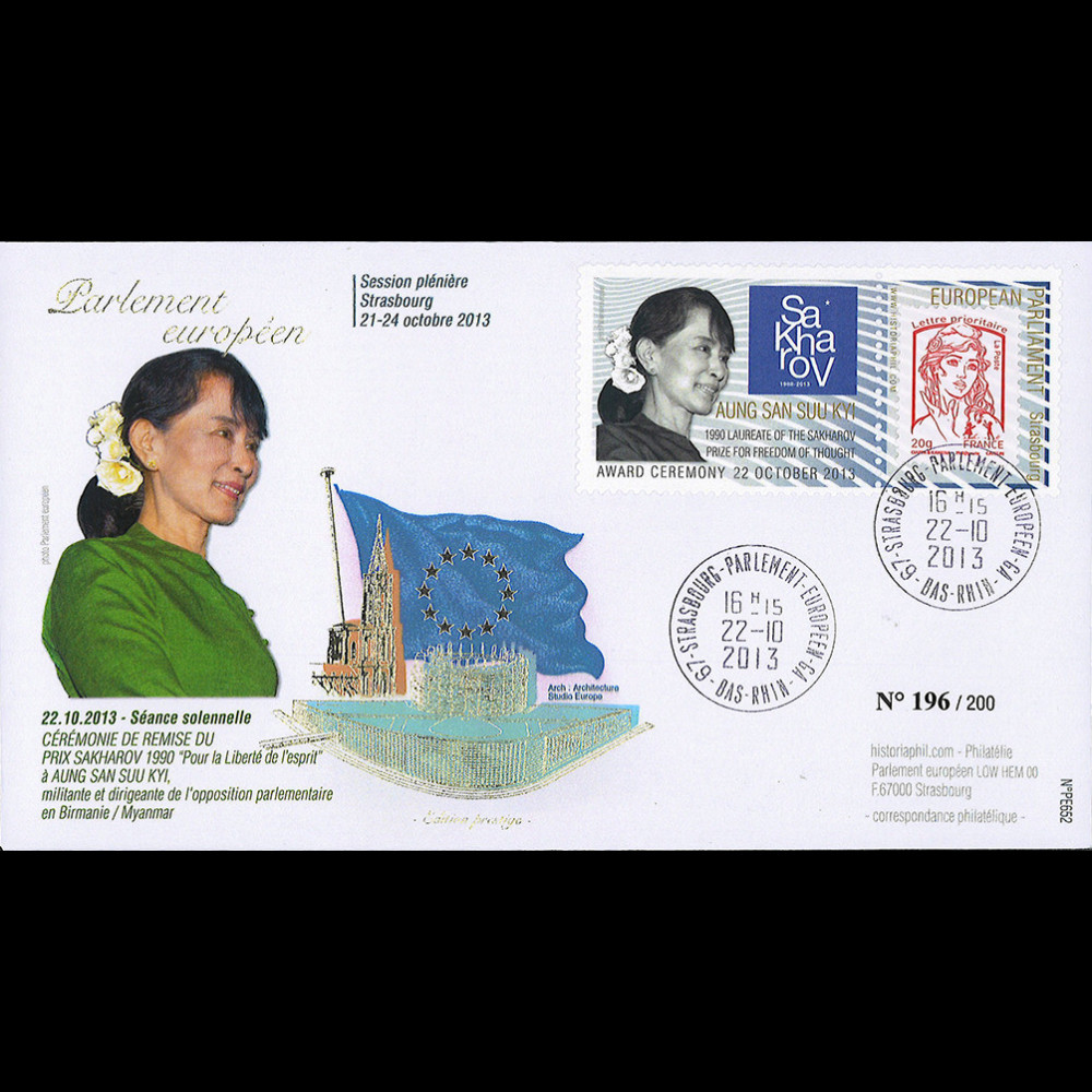N°PE652-T1 : FDC 'Premium edition' Session of the European Parliament to Strasbourg (France) October 21-24, 2013 "October 22, 2013 : Award Ceremony of the 1990 SAKHAROV Prize for Freedom of Thought for Mrs AUNG SAN SUU KYI, Activist and Leader of the Parliamentary opposition in Burma / Myanmar" 2013 :