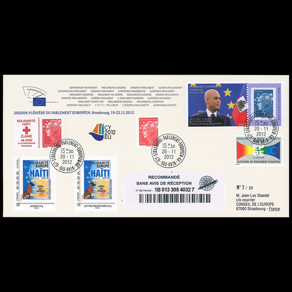 Postmarked in Strasbourg "European Parliament" (France) November 20, 2012