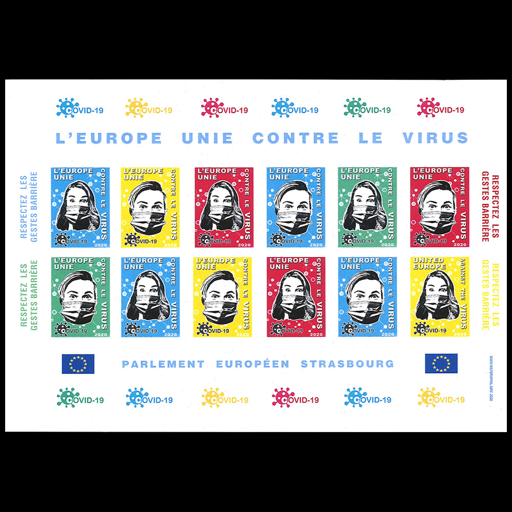 The Philately Kiosk of the European Parliament in Strasbourg has designed a sheetlet of 12 labels “United Europe against the Virus - Respect barrier gestures” to raise public awareness in the fight against the C-19 pandemic.