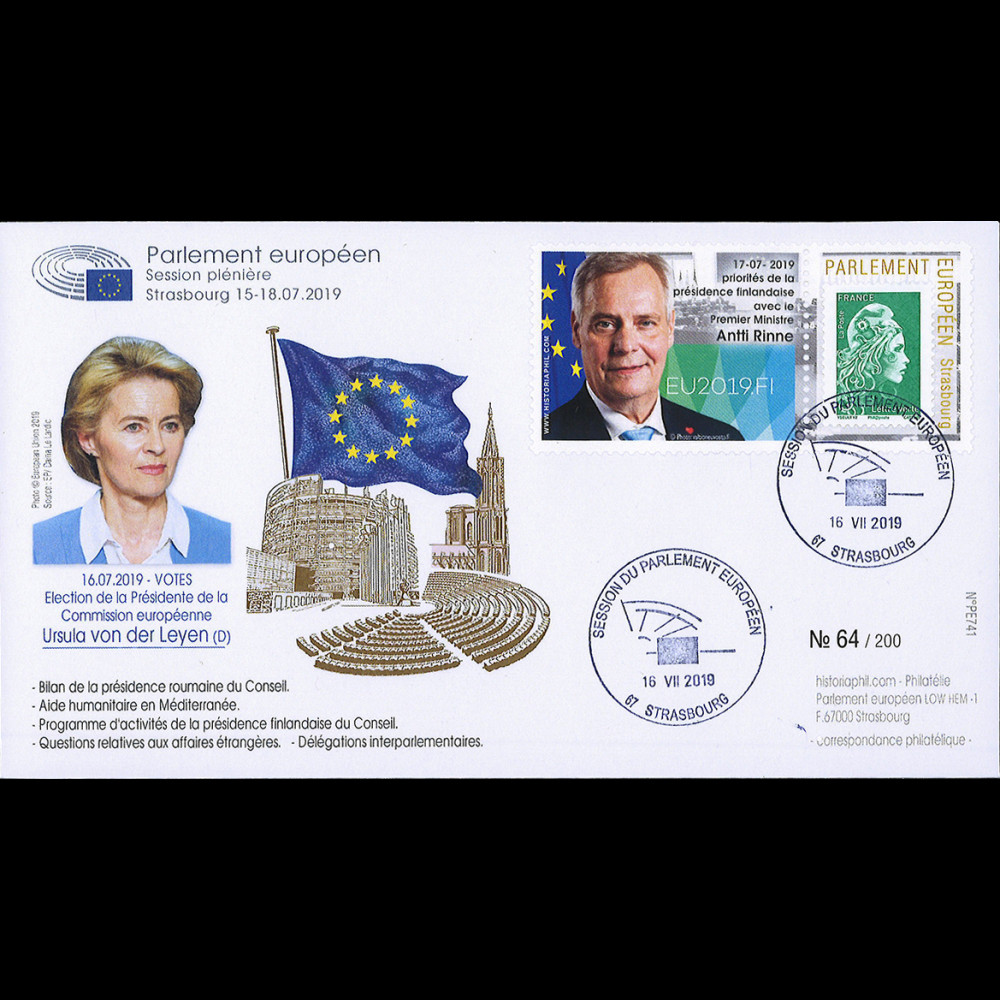 Postage France Green letter 20g "Marianne l'Engagée" on perforated stamp holder "European Parliament, Strasbourg / Presidency Finland EU 2019" Cancellation GF Strasbourg "Session of the European Parliament" 17-09.2019