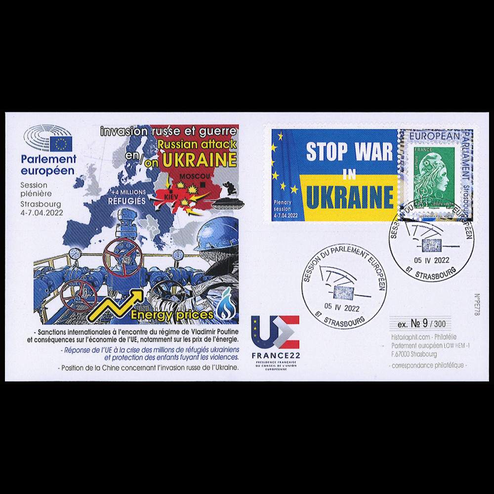 PE778: FDC European Parliament "RUSSIAN MILITARY ATTACK AND INVASION OF UKRAINE - REFUGIES - ENERGY PRICES - SANCTIONS AGAINST VLADIMIR PUTIN'S REGIME"- Postage FRANCE TVP "Marianne Green Letter" fixed on label stamp holder "European Parliament Strasbourg 4-7.04.2022 - NO WAR IN UKRAINE"