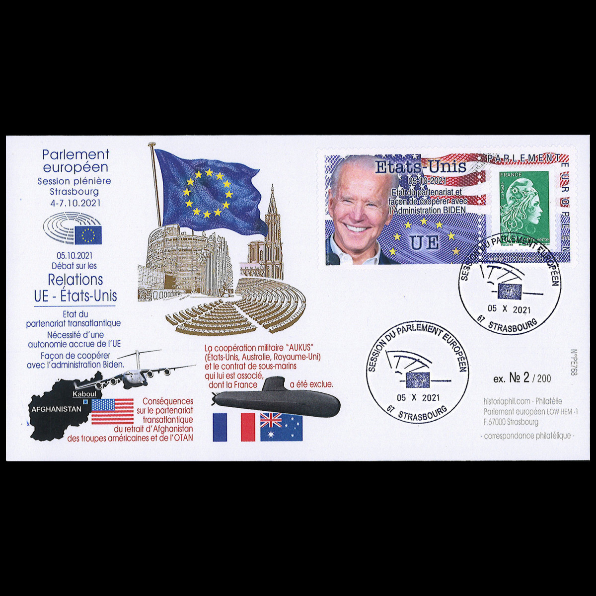 - Postage France Marianne LV 20g on perforated stamp holder "European Parliament 2021 / United States - EU / Status of partnership and way of cooperating with BIDEN Administration" - Cancelled Strasbourg "Session of the European Parliament" 05.10.2021