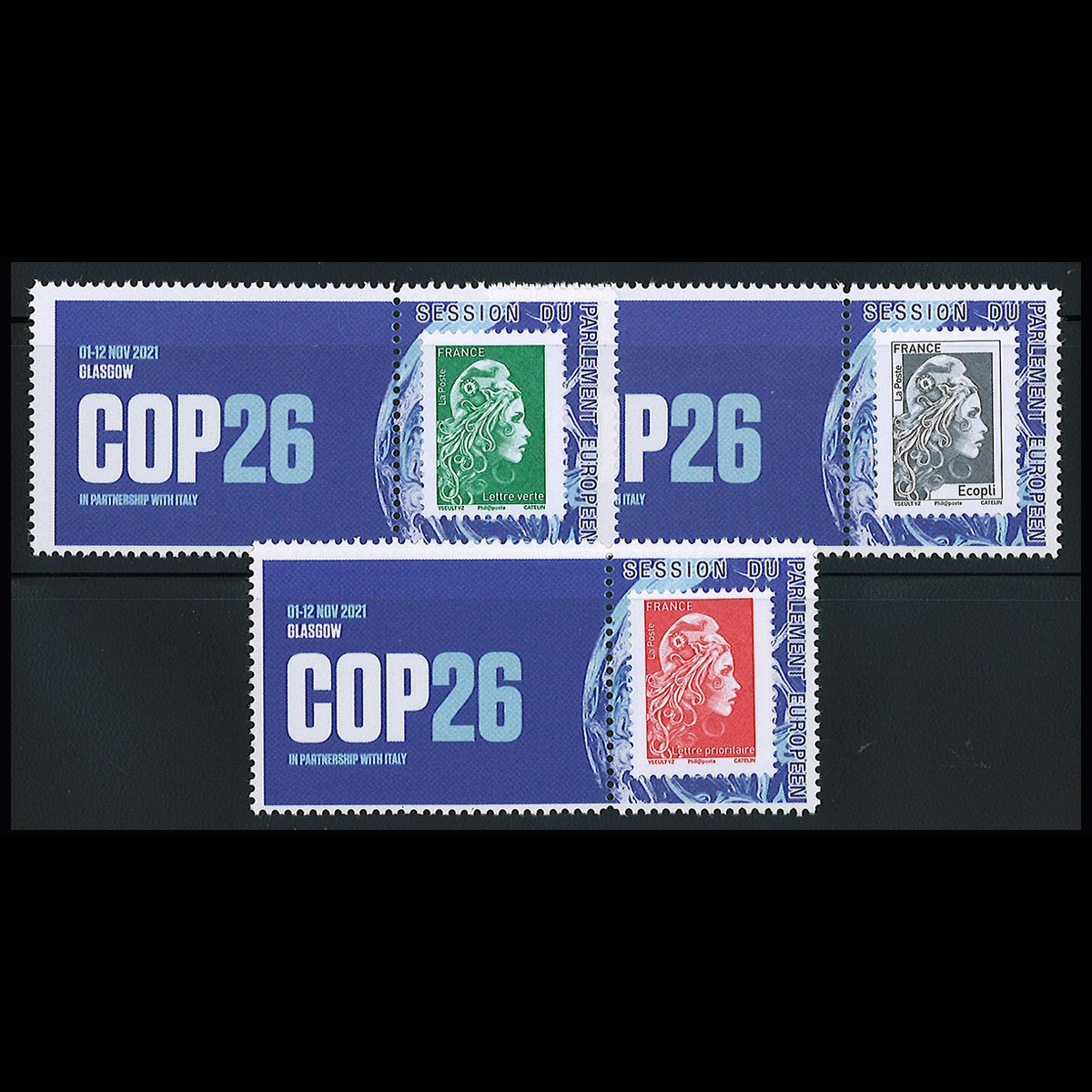 PE769-PT: Set of 3 Perforated Label Stamp Holders "Session of the European Parliament, Strasbourg (France) October II 2021 - COP 26 UN Climate Change Conference, Glasgow"
