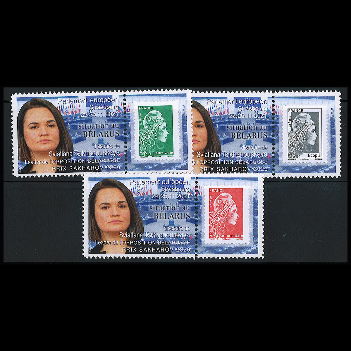 PE770PT: Set of 3 Perforated Label Stamp Holders "Session of the European Parliament, Strasbourg (France) November 2021 - SITUATION IN BELARUS - SPEECH BY OPPOSITION LEADER S. TSIHANOUSKAYA"