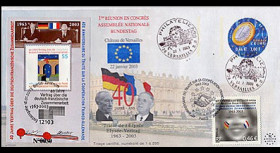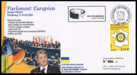 cancellation illustrated postmark "European Parliament" 23.02.05 on band of 5 PS «Cacharel» + vignette GAPA "European Parliament"