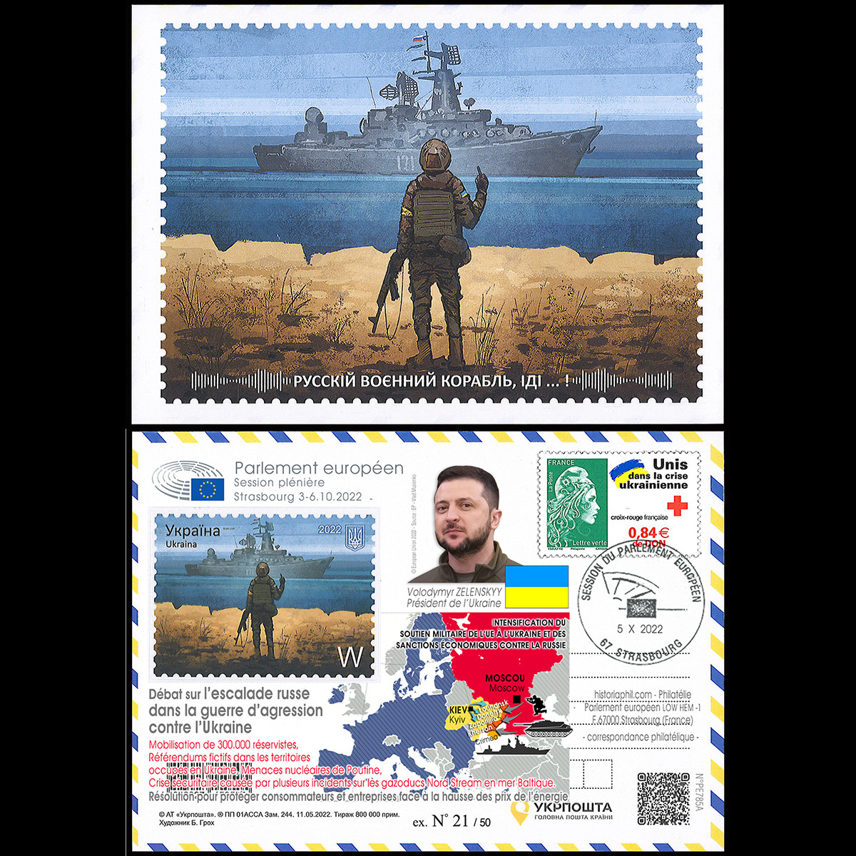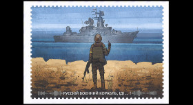 - Ukrainia Post adhesive cinderella, label "RUSSIAN WARSHIP 2022" (Russian warship 'Moskva', flagship of the Russian Navy's Black Sea Fleet, sunk on April 14, 2022 by Ukrainian Forces)